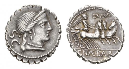 C. Naevius Balbus. Denarius serratus circa 80, AR 18.5mm., 3.81g. Diademed head of Venus right; behind, S·C. Rev. Victory in prancing triga right; above, CXXXIII and in exergue, C·NAE·BALB. Babelon Naevia 6. Sydenham 769b. Crawford 382/1b.