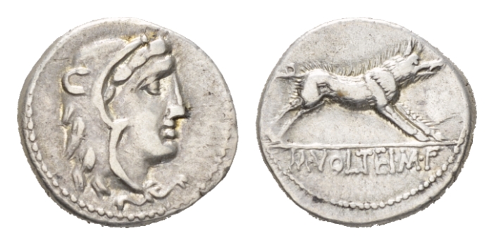 M. Volteius M.f. Denarius circa 78 - Ex Negrini sale 21, 2005, 154., AR 18.5mm., 3.91g. Head of Hercules right, wearing lion’s skin. Rev. Erymanthian boar right; in exergue, M·VOLTEI·M·F. Babelon Volteia 2. Sydenham 775. Crawford 385/2.