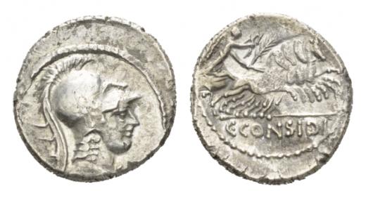 C. Considius Paetus Denarius circa 46, AR 18mm., 3.74g. Helmeted bust of Minerva right, wearing aegis. Rev. Victory in quadriga right, holding palm branch and wreath; in exergue, C·CONSIDI. Babelon Considia 5. Sydenham 994. Sear Imperators 79. Crawford 465/5.