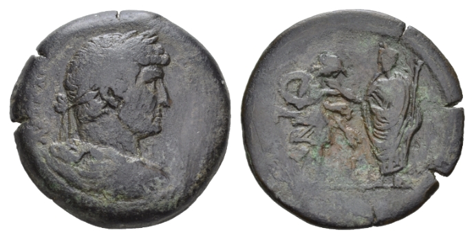 Hadrian, 117-138 Drachm Alexandria circa 130-131 (year 15), Æ 34mm., 23.61g. Laureate, draped, and cuirassed bust right. Rev. Hadrian standing left, holding scepter, greeted by Alexandria, clad in elephant skin headdress, chiton, and peplos, holding two grain ears and kissing Hadrian's extended hand; below [LIE]. Dattari 1610. Geissen 1034.