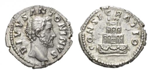 Divo Antonino Pio. Denarius circa after 161, AR 19.5mm., 3.46g. DIVVS ANTONINVS Bare bust right. Rev. CONSECRATIO Four-tier pyre. C 164. RIC M. Aurelius 436. BMC M. Aurelius 57.