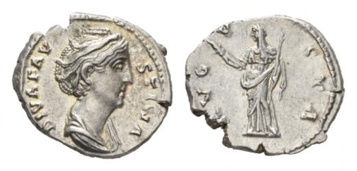 Faustina senior, wife of Antoninus Pius Denarius circa after 141, AR 19mm., 3.46g. DIVA – FAVSTINA Draped bust right. Rev. AVGV – STA Ceres standing facing, head l., holding lighted torch and short vertical sceptre. C 96. RIC A. Pius 356. BMC A. Pius 399.