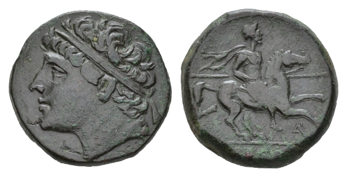 Sicily, Syracuse Bronze circa 275-215, Æ 27mm., 18.55g. Diademed head of Hieron left. Rev IEPΩNOΣ Horseman advancing right, holding spear; below, A. Calciati 195. SNG Cop. 834.