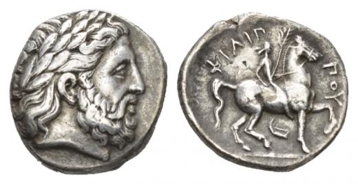 Kingdom of Macedon, Amphipolis Tetradrachm circa 342-328, AR 23.5mm., 13.96g. Laureate head of Zeus right. Rev. ΦIΛIΠ – ΠOY Horseman riding right, wearing causia and raising r. hand; below horse prow. Le Rider, pl. 40, 417.