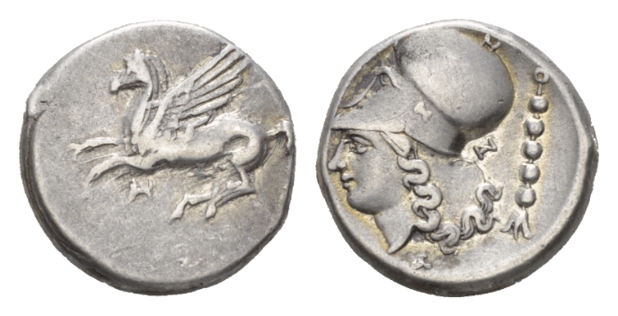 Colonies of Corinth, Argos (Acarnania) Stater circa 350-300, AR 21mm., 8.49g. Pegasus flying left, below, AN ligate. Rev. Head of Athena left, wearing Corinthian helmet; behind neck-guard, AN ligate and ring with pendant. Above head, NAY and below neck truncation, AG ligate. Ravel –. Calciati 73 var. (X below neck).