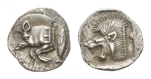 Mysia, Kyzikos Obol circa 450-400, AR 12mm., 0.83g. Forepart of boar left, E (retrograde) on shoulder; behind, tunny. Rev. Head of lion left within incuse square. Von Fritze II, 11. SNG France 378.