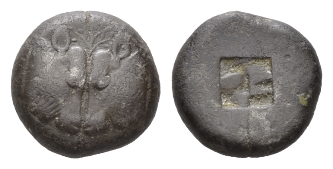 Lesbos, Lesbos Stater circa 550-500, AR 20mm., 10.64g. Two confronted calves’ heads; between them, olive-tree. Rev. Incuse punch. Traité 607 and pl. XV, 14. SNG Copenhagen 285. SNG von Aulock 682.