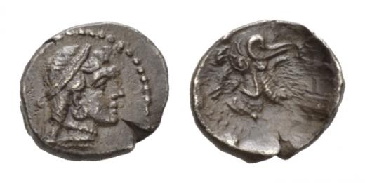 Cilicia, Tarsus Tetartemorion circa 378-344, AR 10.5mm., 0.89g. Diademed head of Aphrodite right. Rev. Helmeted and bearded head r. SNG Levante 81. SNG von Aulock 5416.