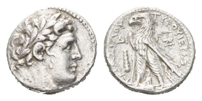 Phoenicia, Tyre Half Shekel circa 63-62, AR 20.5mm., 6.74g. Laureate head right of Melqarth. Rev. Eagle standing left on beak of ship, carrying palm under right wing; in left field date and club. BMC - (date not listed); SNG Cop. -.