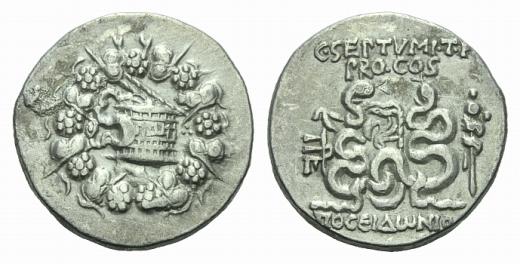 C. Septimius T.f., Proconsul. Cistophoric Tetradrachm circa Pergamon 57-55, AR 25mm., 11.93g. Cista mystica within ivy wreath. Rev. C. SEPTVMI. T. F. PRO. COS, bow case between two serpents; monogram to left, thyrsos to right, below, POCEIDwNIOC.Stumpf 41. SNG France -. SNG von Aulock -.