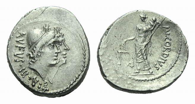 Mn. Cordius Rufus. Denarius circa 46, AR 18mm., 3.95g. ugate heads of Dioscuri r., wearing laureate pileii. Rev. Venus standing l., holding scales and sceptre, Cupid perched on shoulder. B. Cordia 2. Sydenham 976a. Crawford 463/1b