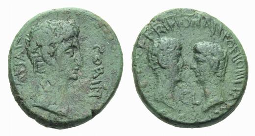 Octavian as Augustus, 27 BC – 14 AD Æ Corinth circa 2-1 BC, Æ 20.5mm., 7.70g. CAESAR / CORINTH Bare head right. Rev. C SERVILIO C F PRIMO M ANTONIO HIPPARCHOS II VIR / C L. Facing busts of Caius and Lucius. RPC 1136. Amandry XI/a.