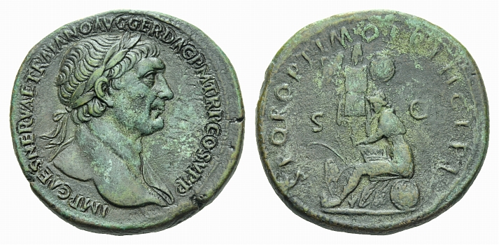 Trajan, 98-117 Sestertius circa 103-111, Æ 34mm., 23.14g. IMP CAES NERVAE TRAINO AVG GER AVG GER DAC P M TR P COS V PP Laureate head r., with drapery on l. shoulder. Rev. SPQR OPTIMO PRINCIPI Dacia seated l. on shield in attitude of mourning; before, trophy. C 531. RIC 560 var.