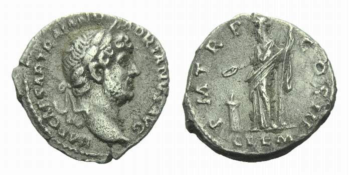 Hadrian, 117-138 Denarius circa 119-122, AR 19mm., 2.94g. IMP CAESAR TRAIAN HADRIANVS AVG Laureate and draped bust right. Rev P M TR P COS III Clementia standing left, holding sceptre and sacrificing from patera over altar; in exergue, CLEMEN. C 212. RIC 116. BMC 251.