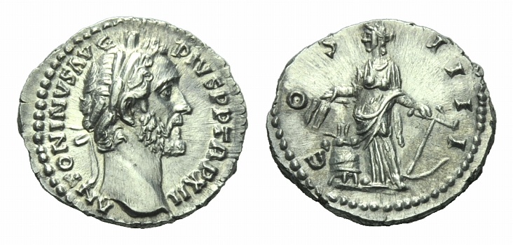 Antoninus Pius, 138-161 Denarius circa 148-149, AR 19mm., 3.28g. ANTONINVS AVG PIVS P P TR P XII Laureate head right. Rev. COS - IIII Annona standing left, holding corn-ears over modius and an anchor. C 284. RIC 175. BMC 657.