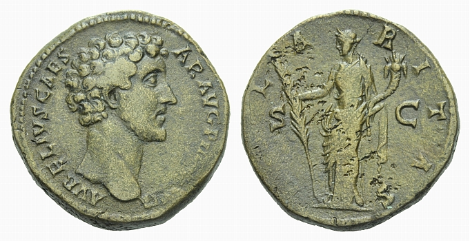 Marcus Aurelius caesar, 139 – 161 Sestertius circa 140-144, Æ 31mm., 24.01g. AVRELIVS CAESAR AVG PII F COS Bare head right. Rev. HILARITAS Hilaritas standing left, holding palm and cornucopiae. C 230. RIC 1230.