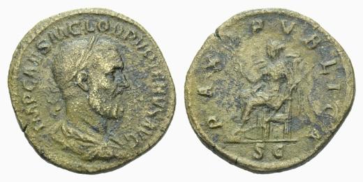 Pupienus, 22nd April – 29th July 238 Sestertius circa April-July 239, Æ 31.5mm., 18.36g. IMP CAES M CLOD PVPIENVS AVG Laureate and draped bust r. Rev. PAX PVBLICA Pax seated l., holding branch and sceptre; in exergue, S C. C 23. RIC 22a. BMC 48.