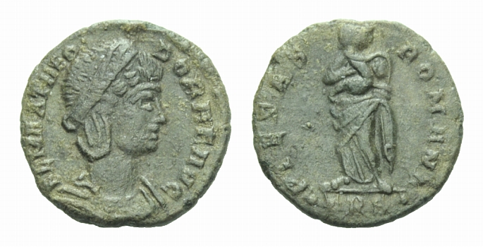 Theodora, wife of Constantius I Æ4 Treveri circa 340, Æ 15.5mm., 1.63g. Draped bust right. Rev. Pietas right, holding child with both arms; in exergue, ·TRP·. RIC 65. LRBC 113.
