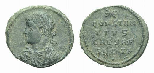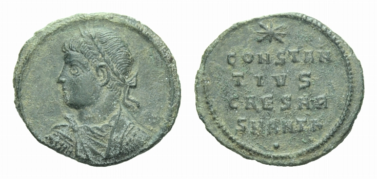Constantine II Caesar, 316-337 Æ3 Antioch circa 325, Æ 18.5mm., 1.85g. Laureate, draped, and cuirassed bust left. Rev. CONSTAN/TINVS/CAESAR in three lines; above, star. In exergue, SMANTA/•. RIC 59. LRBC 1325.