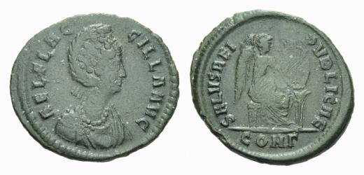 Aelia Flaccilla, wife of Theodosius I Æ2 Constantinople circa 378-383, Æ 24.5mm., 4.82g. AEL FLAC-CILLA AVG Draped bust right, with elaborate headdress, necklace and mantle. Rev. SALVS REI PVBLICA Victory seated right, inscribing Christogram on shield set on column; in exergue, CONΓ. RIC 55. LRBC 2149.