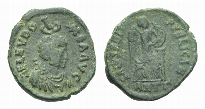Aelia Eudoxia, wife of Arcadius Æ3 Antiochia circa 401-403, Æ 17mm., 2.56g. AEL EVDO-XIA AVG Pearl-diademed and draped bust right, being crowned by manus Dei. Rev. Victory seated right on cuirass, supporting shield inscribed with a Christogram; in exergue, ANTΓ. RIC 104. LRBC 2800.