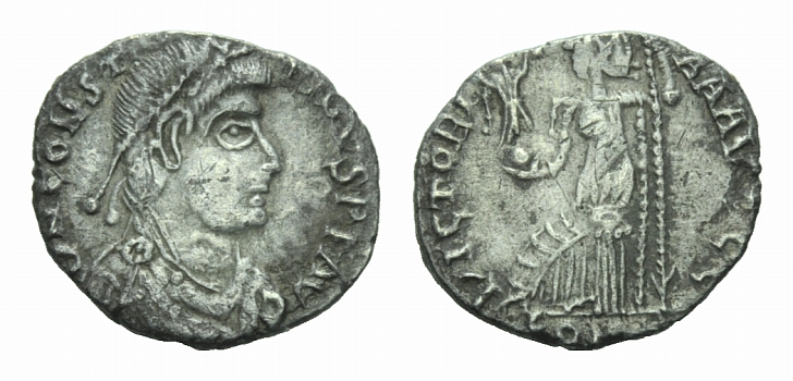Constantine III, 407-411 Siliqua Arelate circa 408-411, AR 16mm., 1.56g. D N CONSTAN-TINVS P F AVG Pearl-diademed, draped, and cuirassed bust right. Rev. VICTORI-A AVGGGG Roma seated left; holding spear and Victory on globe. In exergue, KONT. C 4. RIC 1539. King 5.