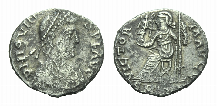 Jovinus, 411-413 Siliqua Lugdunum circa 411-413, AR 15.5mm., 1.55g. D N IOVINVS PF AVG Pearl-diademed, draped, and cuirassed bust right. Rev. Roma seated left on throne, holding Victory on globe and reversed spear; in exergue, SMLDV. C 4. RIC 1716. King, Fifth 8.