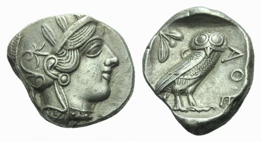 Attica, Athens Tetradrachm 430-420, AR 23.5mm., 16.91g. Head of Athena r., wearing crested helmet, earring and necklace; bowl ornamented with spiral and three olive leaves. Rev. ΑΘΕ Owl standing r., head facing; in upper field l., olive twig with two leaves and berry. All within incuse square. Svoronos Pl XII.