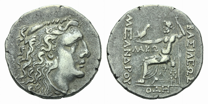 Kingdom of Pontus, Mithradates VI Eupator, 120-63 Tetradrachm Odessus 125-70, AR 29mm., 15.98g. Head of Heracles r. Rev. ΒΑΣΙΛΕΩΣ ΑΛΕΞΑΝΔΡΟΥ Zeus seated on throne left, holding eagle and sceptre; in front ΛAKΩ and in exergue, OΔH. Price 1199.