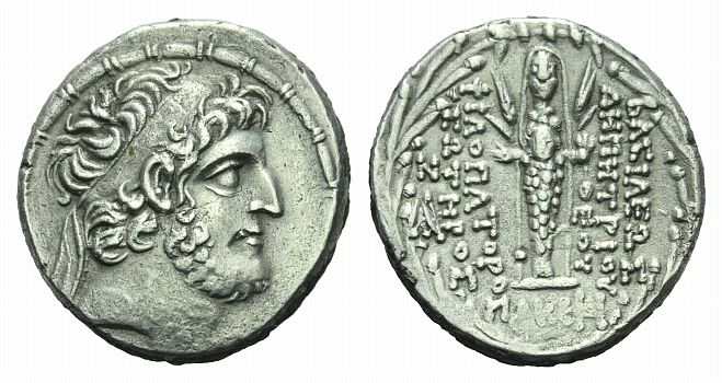 The Seleucid Kings, Demetrius III Eucaerus, 97-87 BC Tetradrachm Damascus 89-88, AR 28mm., 15.19g. Diademed, bearded head right. Rev. BACIΛEΩC ΔEMETPIOV ΘEOV Cultus statue of Atargatis facing, ear of corn either side of head, in left field, monograms. Seleucid Coins 2451.11.
