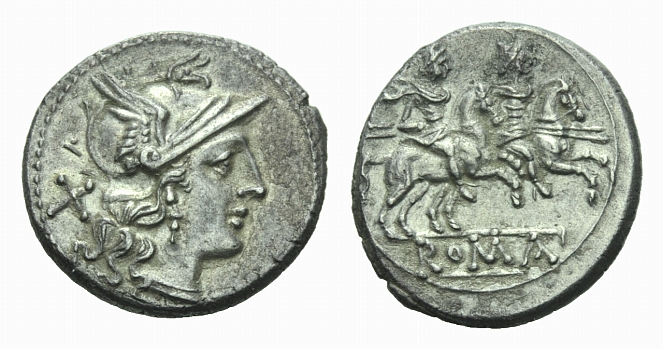 Rudder series. Denarius circa 206-195, AR 19.5mm., 4.25g. Helmeted head of Roma right; behind, X. Rev. The Dioscuri galloping right; below, ROMA in partial tablet. Sydenham cf. 261 (rudder). Crawford cf. 117A/1 (rudder).