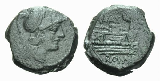 Pinarius Natta Triens circa 155, Æ 22mm., 9.16g. Helmeted head of Minerva r.; above, four pellets. Rev. Prow r.; above NAT and before, four pellets. Below, ROMA. Babelon Pinaria 5. Sydenham 383b. Crawford 200/4.
