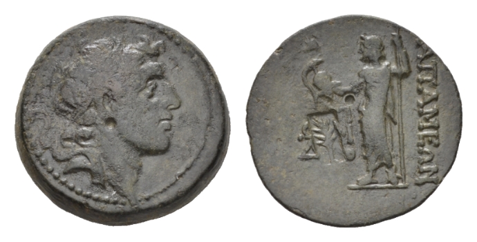 Syria, Apamea on the Axios Bronze Dated SE 163 (150/49 BC)., Æ 21mm., 7.95g. Laureate head right / Zeus standing l.; date and monogram to l.; c/m: palm frond within incuse rectangle. SC 1804a; HGC 9, 904; DCA 133.