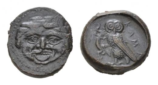Sicily, Camarina Tetras 420-410, Æ 14.5mm., 3.40g. Gorgoneion, hair bound with fillet. Rev. KAM Owl standing l. on one leg, clutching lizard with the other claw; in exergue, three pellets. Calciati III, 26. Westermark-Jenkins 195.14. SNG ANS 1226.