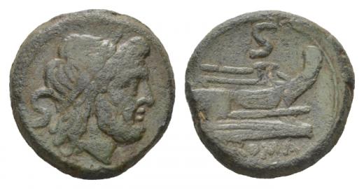 Semis circa after 211, Æ 27mm., 18.75g. Laureate head of Saturn r; behind, S. Rev. Prow r.; above, S and below, ROMA. Sydenham 143a. Crawford 56/3