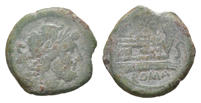 Star (second) series Semis circa circa 169-158, Æ 25mm., 12.04g. Laureate head of Saturn r.; behind, S. Rev. Prow r.; above, six-rayed star and before, S. Below, [R]OMA. Sydenham 264a. Crawford 196/2.
