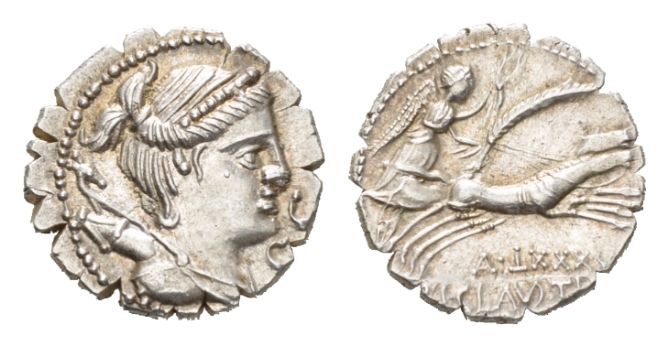 T. Claudius Nero Denarius serratus circa 79, AR 19mm., 3.38g. Draped bust of Diana right, with bow and quiver over shoulder; before chin, S.C. Rev. Victory in prancing biga right, holding palm-branch and reins in l. hand and wreath in r.; below horses, A·ÚXXXV. In exergue, TI·CLAVD·TI·F / AP·N. B. Claudia 5. Sydenham 770a. Crawford 383/1.