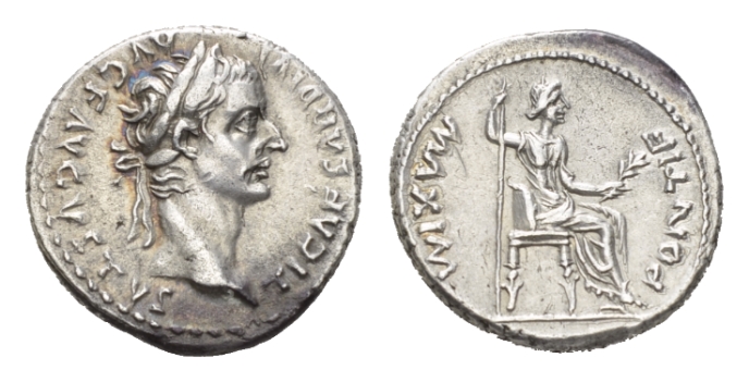 Tiberius, 14-37 Denarius Lugdunum circa 14-37, AR 19mm., 3.79g. TI CAESAR DIVI – AVG F AVGVSTVS Laureate head r. Rev. PONTIF – MAXIM Pax-Livia figure seated r., holding sceptre in r. hand and branch in l. C 16. BMC 48. RIC 29. CBN 34.