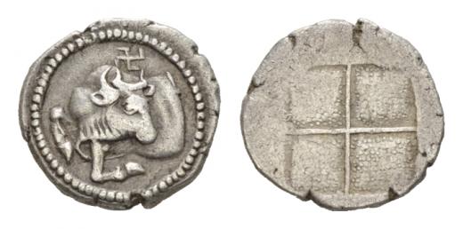 Macedonia, Acanthus Tetrobol 424-380, AR 16mm., 2.37g. Forepart of bull l.; above, swastika. Rev. Quadripartite granulated incuse square. SNG Cop. 17. SNG ANS 42.