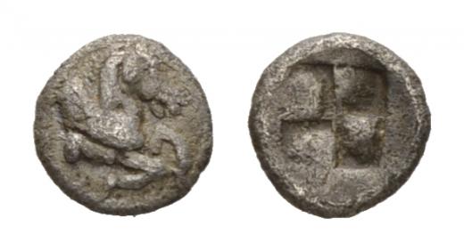 Macedonia, Argilos Thirty-Second Stater circa 495-477, AR 8mm., 0.42g. Forepart of Pegasos r. Rev. Quadripartite incuse square. Liampi 73. SNG ANS 763 (Thermae).