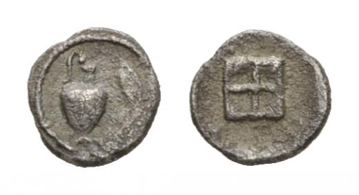 Macedonia, Terone Hemiobol Late V cent. BC, AR 7mm., 0.24g. Oinochoe, to right, stork. Rev. Quadripartite square within incuse square. Hardwick Group V, pl. 29, 16 var.