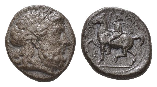 Kingdom of Macedon, Philip II, 359 – 336 and posthumous issues Tetradrachm Amphipolis 355-348, AR 22.5mm., 13.76g. Laureate head of Zeus r. Rev. ΦIΛIΠ - OY Philip on horseback left, raising right hand, holding reins in left; below horse's raised foreleg, bow. SNG ANS 478. Le Rider 154.
