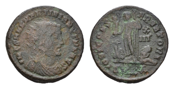 Martinian, 324 Follis Cyzicus circa 324, Æ 20.5mm., 2.99g. IMP CS MAR MARTINIANVS P F AVG Radiate, draped and cuirassed bust right. Rev. IOVI CONS – ERVATORI Jupiter standing left, holding Victory on globe in r. hand and eagle-tipped sceptre in l.; at feet, eagle holding wreath in beak. In upper field r., X / IIΓ and below, captive on ground. In exergue, SMKA. RIC 16. C. -.