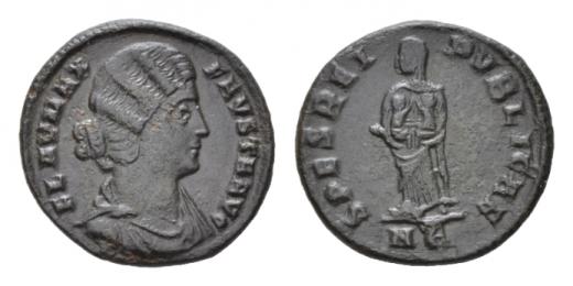 Fausta, wife of Constantine Follis Nicomedia circa 325-326, Æ 19.5mm., 3.32g. FLAV MAX FAVSTA AVG Draped bust right. Rev. SPES REI PVBLICA Empress standing left, holding two children, in exergue, N A. RIC 150.
