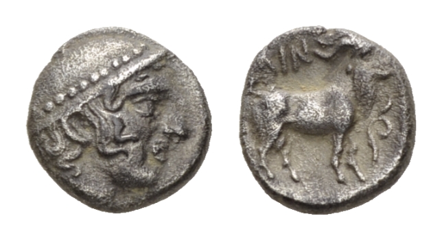 Thrace, Ainos Diobol Circa 427/6-425/4 BC., AR 10mm., 1.16g. Head of Hermes r., wearing petasos. Rev. Goat standing r.; coiled serpent before. May, Ainos 176. AMNG II 303. SNG Copenhagen 405.