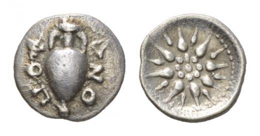 Locri Opuntii, Obol second quarter of the 4th century BC, AR 12mm., 0.72g. Amphora, O Π l. down, O N r. up. A bunch of grapes hangs over the handle from the left side of the vase’s mouth and an ivy leaf from the right side. Rev. Stylized star of 16 rays, 8 of the rays slightly overlapping the other 8; in the centre, dot in a circle of 8 dots. The whole in a dotted circle. Corpus group 7a. SNG Tübingen 1573. BCD-Lokris-Phokis 37.