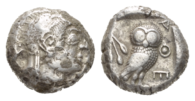 Attica, Athens Tetradrachm Circa 500-485 BC., AR 21mm., 17.36g. Head of Athena r., wearing crested Attic helmet. Rev. ΑΘΕ Owl standing facing, head r., olive spring behind. All within incuse square. Cf. Svoronos Pl. 5. cf. Asyut pl. XVIII.