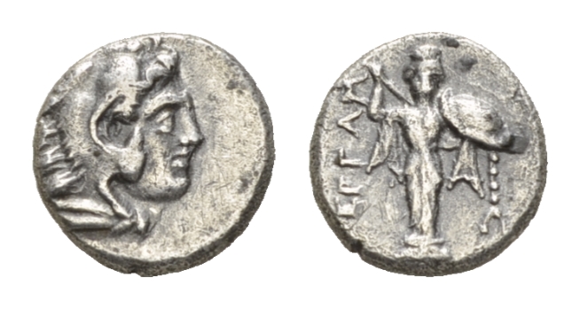 Mysia, Pergamon Diobol Circa 310-282 BC., AR 10mm., 1.23g. Head of Herakles r., wearing lion skin. Rev. Archaistic Palladion: statue of Pallas Athena standing facing, holding spear and shield. Von Fritze, Pergamon pl. I, 10. SNG France 1559. SNG von Aulock 1349.