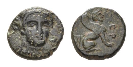 Troas, Bronze Circa 350-300 BC., Æ 11mm., 2.03g. Head of Sibyl Herophile facing slightly r., wearing laurel wreath and pendant necklace. Rev. Sphinx seated r. SNG Copenhagen 338.