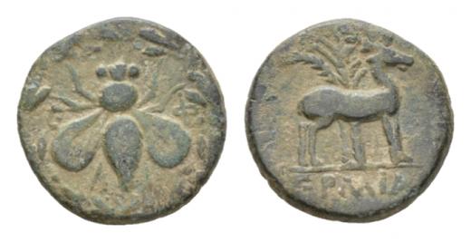 Ionia, Ephesos Bronze Circa 202-133 BC., Æ 17mm., 3.07g. Hermias, magistrate. Bee within wreath. Rev. EPMIAΣ Stag standing r. before palm tree. BMC 140.
